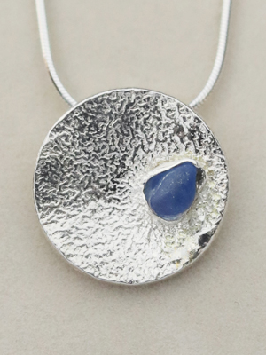 Ref 02 // Reflection £60 Hand forged, textured disc, bezel mounted deep blue sea glass. Choice of chain available.