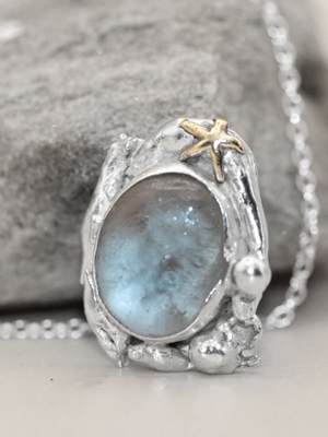 Ref 18 // ROCKPOOL *NEW* £85 Scottish seaglass surrounded by water cast silver & small starfish. Choice of chain available.